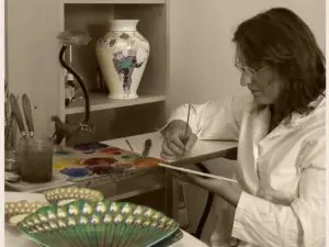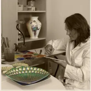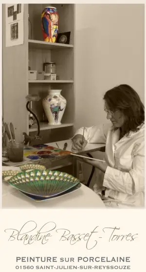 They are entirely hand-painted with vitrifiable colors requiring one or more firings to ensure their durability. Various pieces are offered, from tableware to vases, including small decorative objects or utility items (door knobs). Blandine Basset also offers decorations on porcelain plates and ceramic tiles.