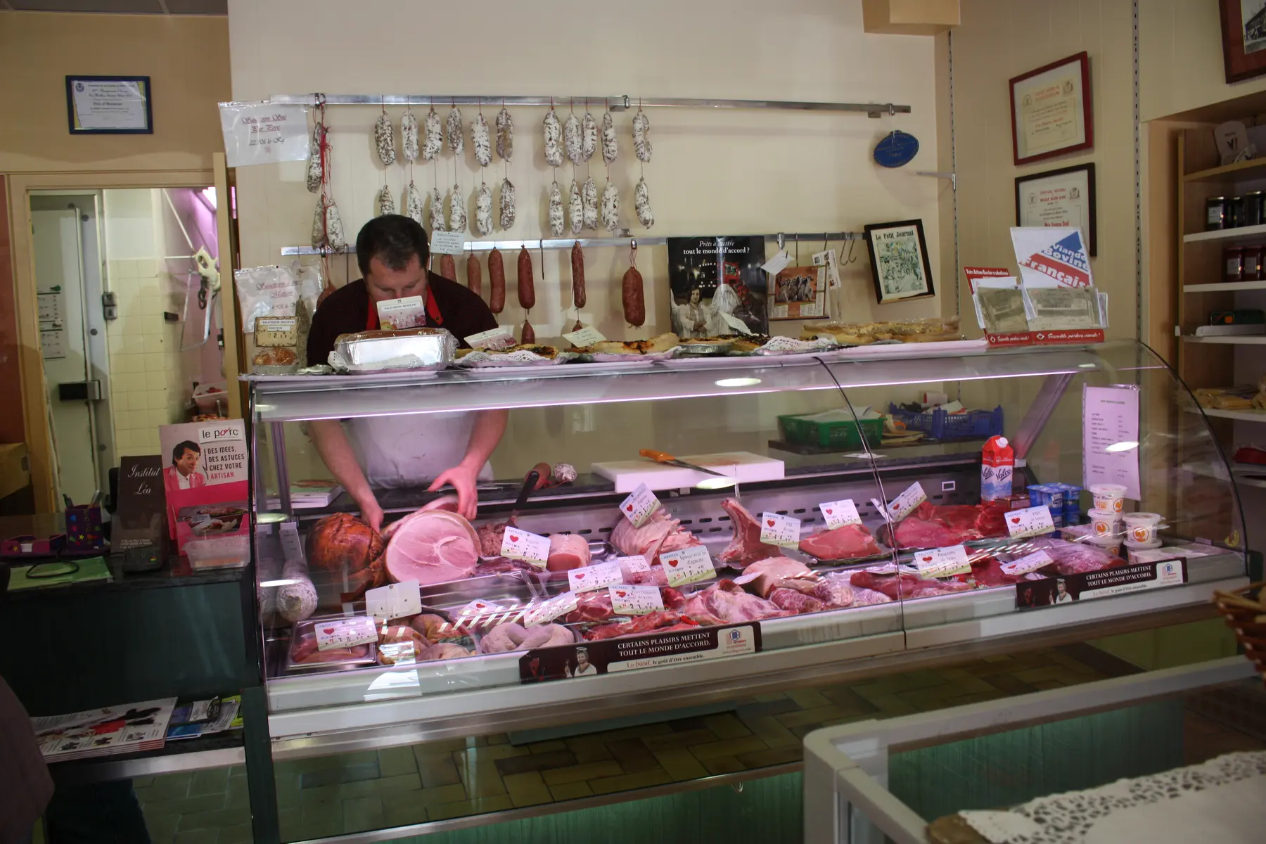Butcher's shop, delicatessen, caterer, poulterer.