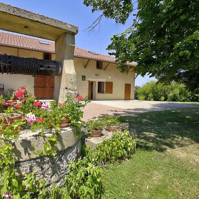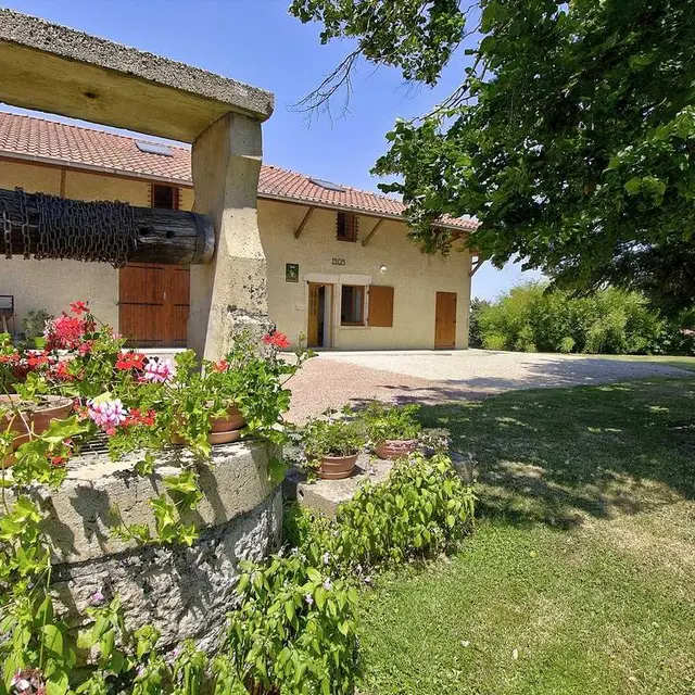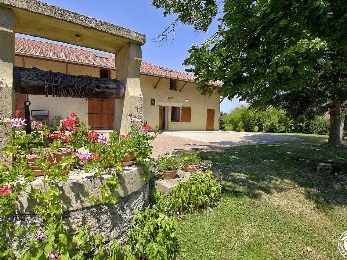 Gîte adjoining owners' holiday home at meeting point of three departments (Ain, Saône-et-Loire and Jura), 5 minutes from A39 motorway. Fully renovated farm in open countryside for up to 6 people (3 bedrooms). Ground floor: entry direct into lounge area (beamed ceiling, pleasanr uncluttered décor with a few brightly coloured details), open-plan fitted kitchen, separate WC (wash hand basin). Dining area with access to covered terrace (fine view of surrounding countryside). 1st floor: corridor leading to 3 air conditioned bedrooms in different colours. Beige bedroom (queen-size bed, reading area), Blue room (two 90x200cm beds), Chocolate room (two 90x200cm beds). Spacious shower room, separate WC. Small storage area with baby equipment.|Bonus features: charges (electricity, heating) included in rent. Enjoy a relaxing holiday in this leafy setting where you may catch sight of a doe and her stag, get to know Minus the cat and explore this region with a rich architectural heritage and lots of leisure activities.