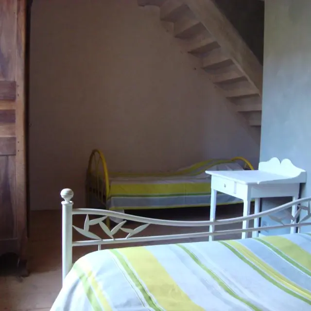 The gîte, which has been awarded the Accueil Paysan label, consists of a large living room with a kitchenette, wood stove and sofa.