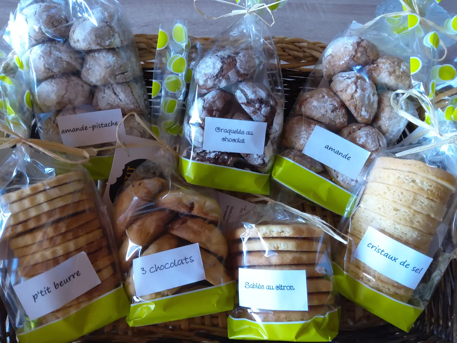 In individual bags: almond macaroons, almond/pistachio macaroons, salt crystal shortbread, p'tit beurre cookies, lemon shortbread, 3-chocolate cookies, chocolate cracker cookies.