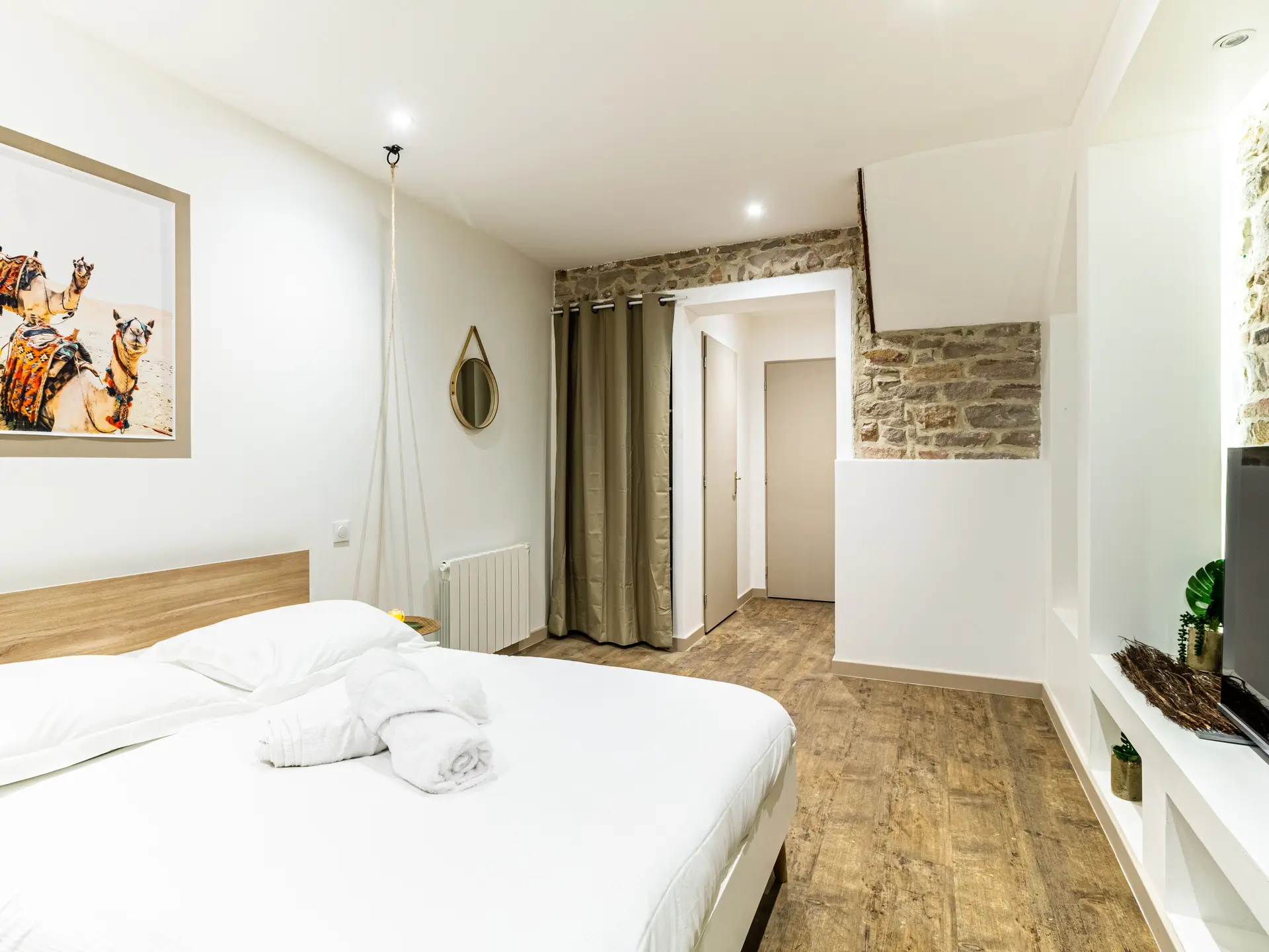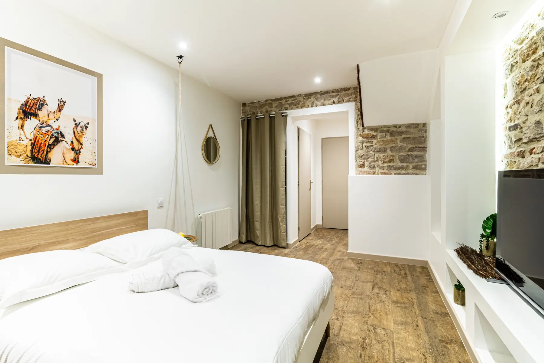 Our desert-inspired apartment features a spacious bedroom with a comfortable double bed, quality bedding and a flat-screen TV. Decorative touches evoking the world of camels and dunes add a touch of escape to your stay.