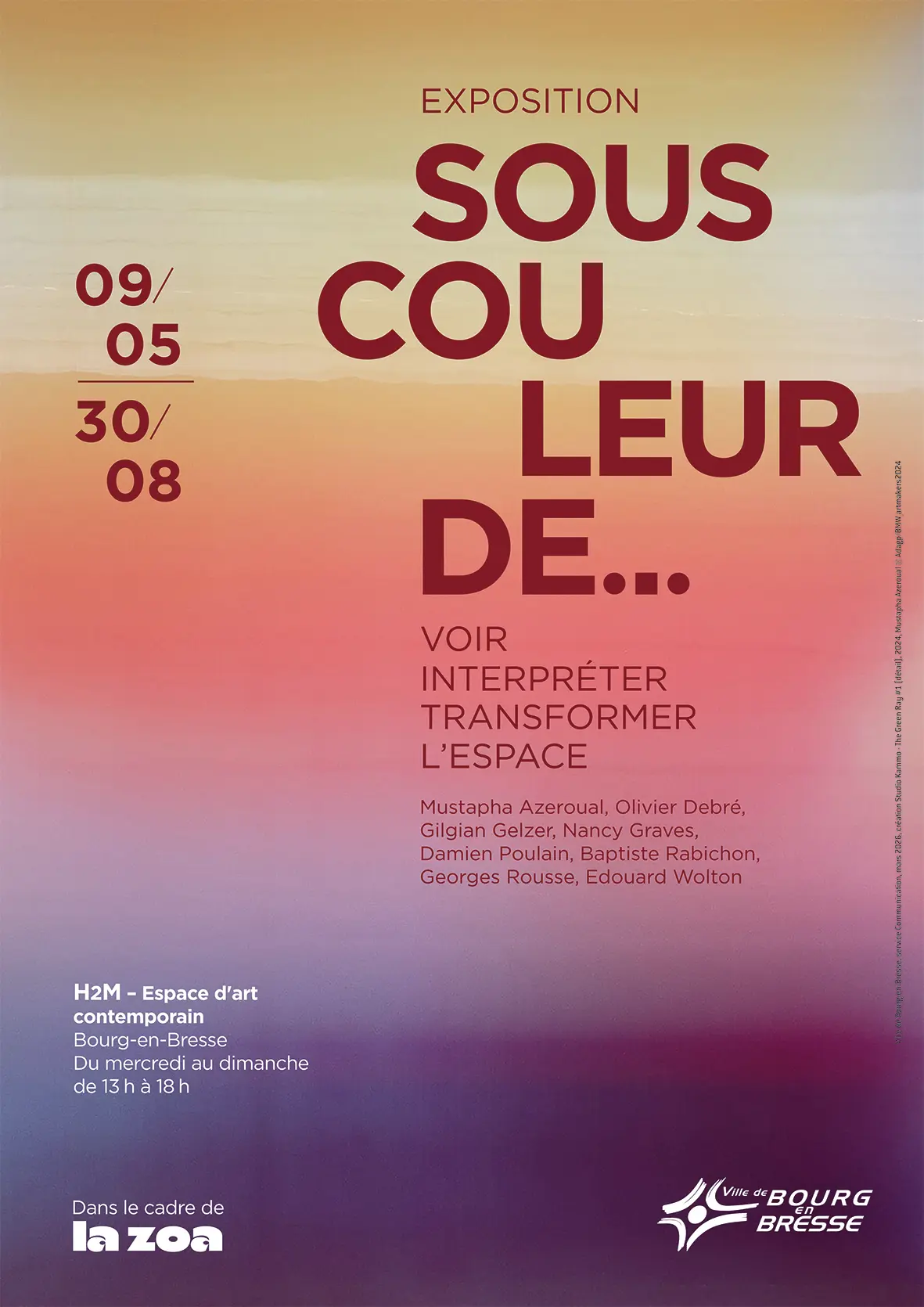 As part of ZOA, the exhibition Sous couleur de... explores the relationship between color and space through works by Mustapha Azeroual, Olivier Debré, Gilgian Gelzer, Nancy Graves, Damien Poulain, Baptiste Rabichon, Georges Rousse and Edouard Wolton.
